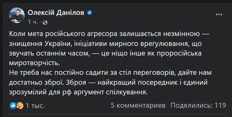 "Коли мета російського агресора залишається незмінною - знищення України, ініціативи мирного врегулювання, що звучать останнім часом, - це ніщо інше як проросійська миротворчість. Не треба нас постійно садити за стіл переговорів, дайте нам достатньо зброї. Зброя - найкращий посередник і єдиний зрозумілий для РФ аргумент спілкування", - написав секретар РНБО України Олексій Данилов.