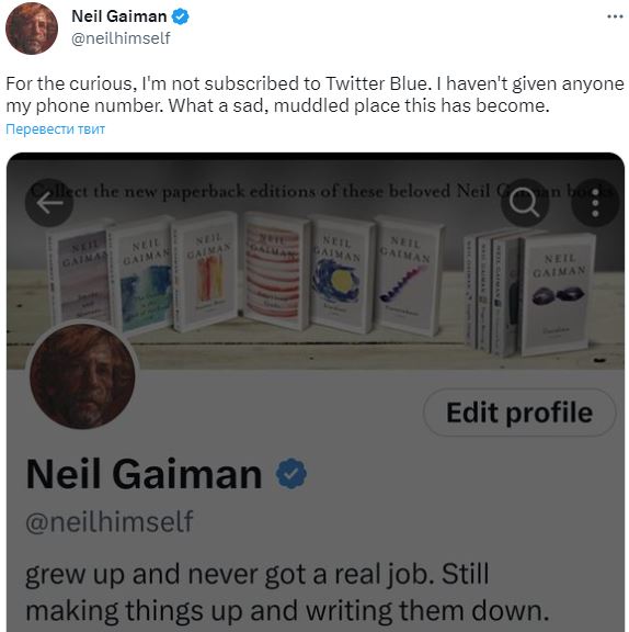 "Я не підписаний на Twitter Blue і нікому не давав свій номер телефону. Яким сумним, заплутаним стало це місце", – написав Гейман.