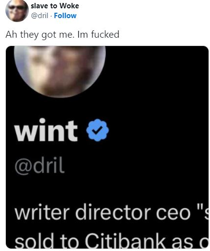 Комік Дочні написав, що "його дістали" і швидко змінив свій нік "dril", під яким його знають, на "slave to Woke", після чого втратив синю галочку.