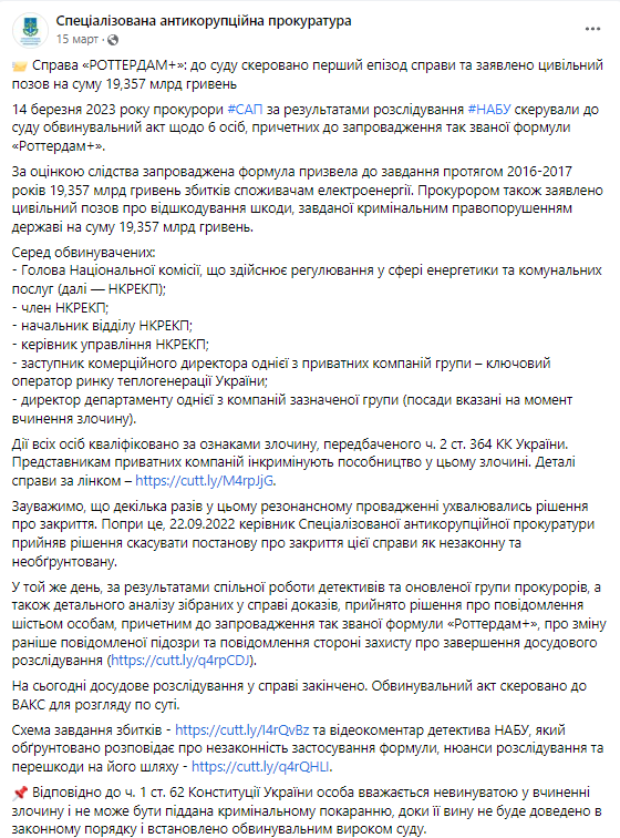"25 квітня 2023 року у Вищому антикорупційному суді розпочато підготовче засідання у справі за обвинуваченням 6 осіб, причетних до введення так званої формули "Роттердам+". У судовому засіданні суд задовольнив клопотання прокурора САП та ухвалив рішення здійснювати спеціальне судове провадження щодо, яка здійснює регулювання у сфері енергетики та комунальних послуг (далі — НКРЕКУ) та начальника відділу НКРЕКУ (посади зазначені на момент скоєння злочину), які ховаються від досудового розслідування та суду", - йдеться у повідомленні.