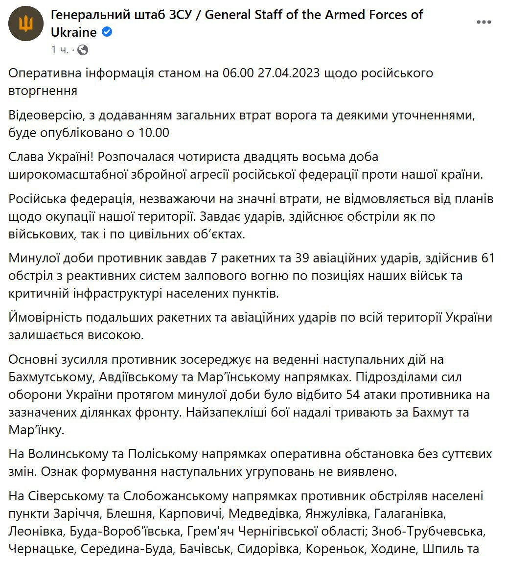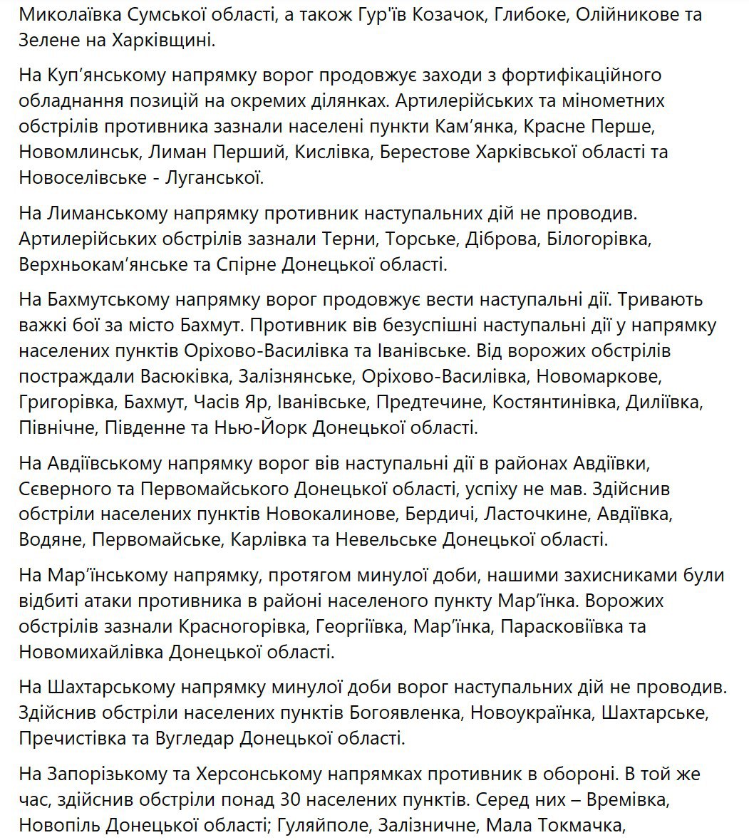 РФ за минулу добу здійснила 54 атаки. Тривають тяжкі бої за Бахмут. Також на цьому напрямі росіяни атакували Оріхово-Васильівку та Іванівське.