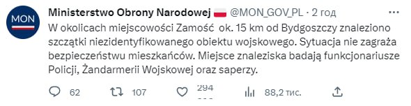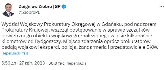 09.56 Міністр юстиції Польщі Збігнєв Зебро повідомив про виявлені залишки повітряного військового об'єкта.