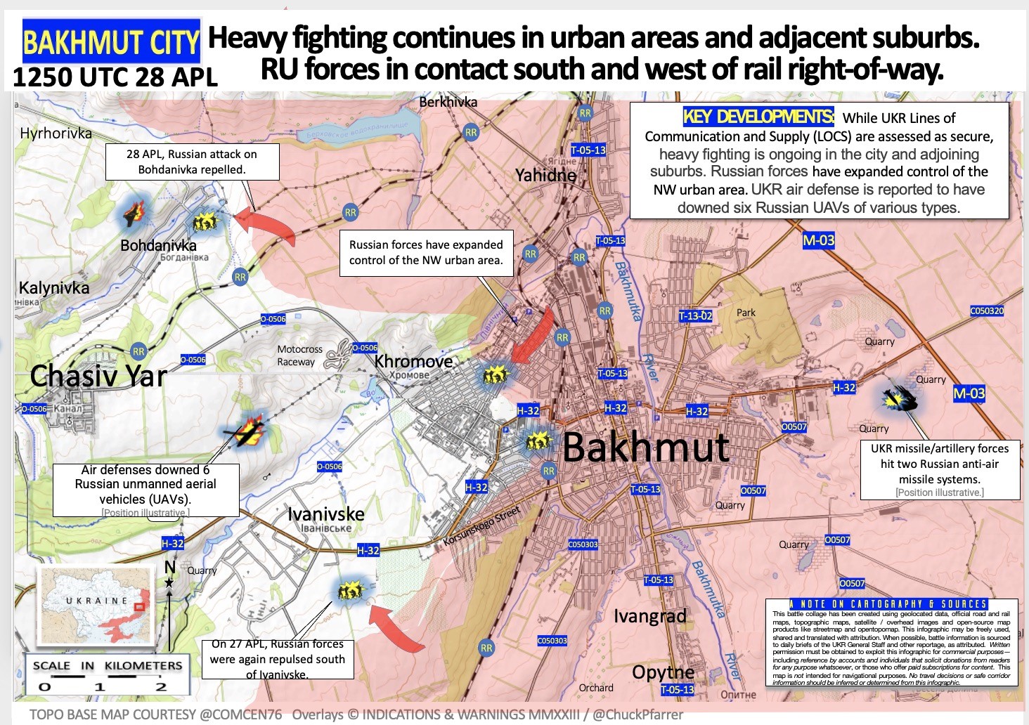 Журналіст німецького видання Bild Юліан Ріпке, який спеціалізується на ситуації в Україні, вважає, що Україна втратила можливість вільно переміщувати техніку до Бахмуту та назад. У Твіттері він написав, що ЗСУ "втратили" траси через Хромове та Іванівське, які щільно прострілюються росіянами.