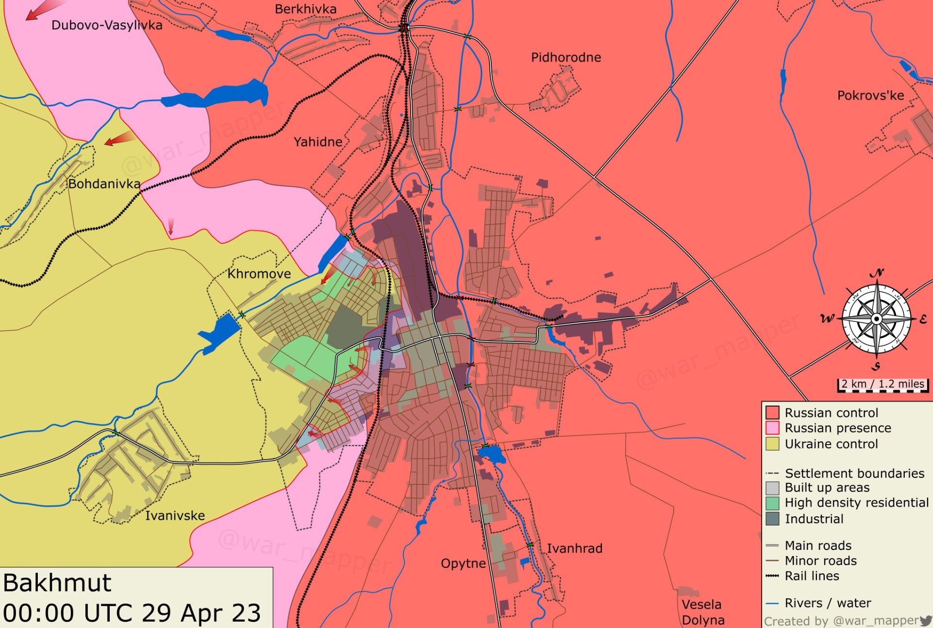 У "Вагнера" повідомляють, що захопили територію колишніх військових складів на заході Бахмута (вони евакуйовані звідти ще 2014 року) і рухаються на південний захід вулицями Леванєвського та Чайковського. Куратор ПВК Пригожин каже, що залишилося захопити територію "два на півтора кілометри". Україна цих даних не підтверджувала.