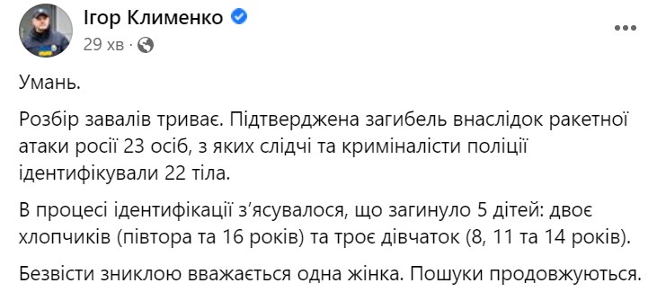 Під час ідентифікації тіл з'ясувалося, що внаслідок удару російської ракети по багатоповерхівці в Умані загинули п'ятьох дітей.