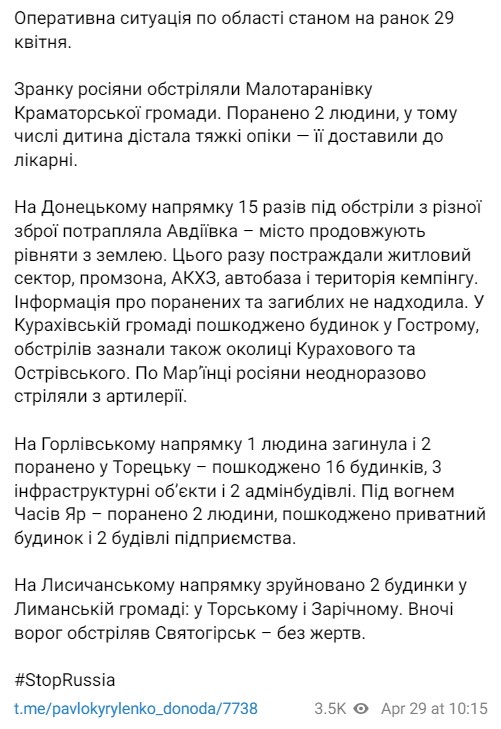 Про це пише в телеграм голова Донецької ОВ Павло Кириленко у своєму телеграм-каналі.