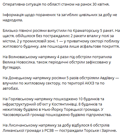 Краматорськом близько опівночі росіяни випустили п'ять ракет - дві впали в поле за містом, дві - в промисловій зоні, одна - в приватному секторі поблизу житлового будинку.