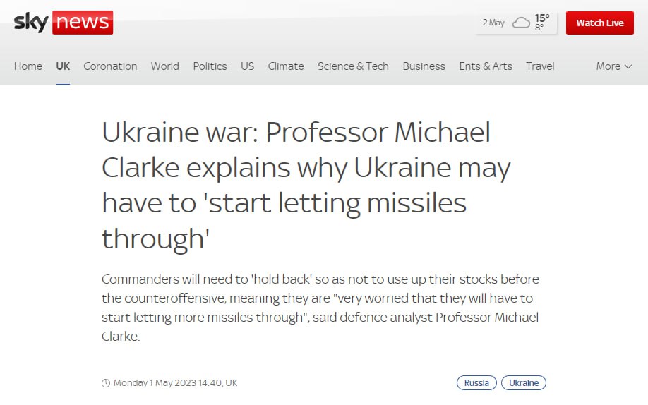 10:11 Україні, можливо, доведеться "почати пропускати ракети", які запускає РФ, пише Skynews з посиланням на слова військового експерта Майкла Кларка.