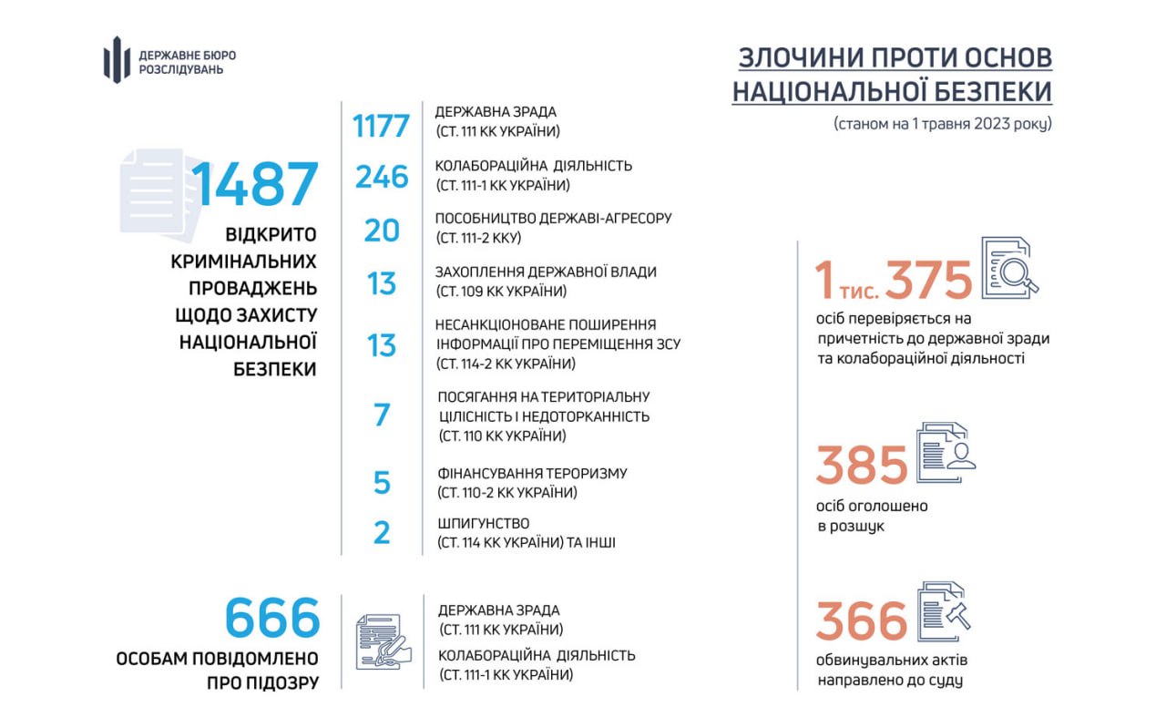 Про підозру повідомили 666 осіб. 385 осіб у розшуку, 1375 осіб перевіряються на причетність до держзради та колабораціонізму.