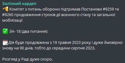 Як повідомляє нардеп Ярослав Железняк, з 19 травня військовий стан продовжать "і дуже ймовірно - знову на 90 днів, тобто до середини серпня".