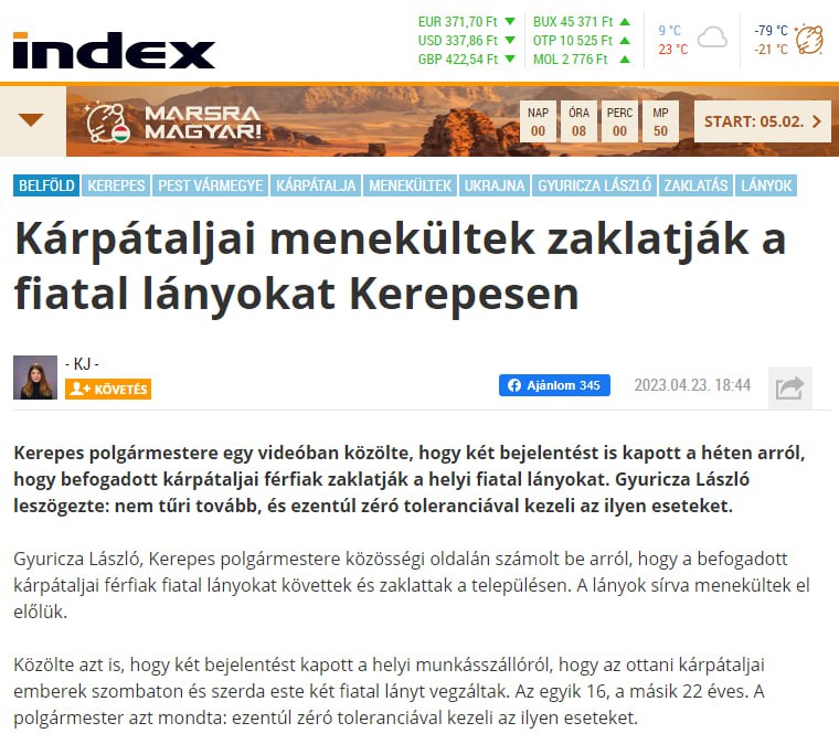 11.08 Мер угорського Керепеша загрожує українським біженцям "нульовою толерантністю".
