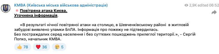 Пізніше стало відомо, що внаслідок нічної атаки у Шевченківському районі столиці у житловій забудові виявлено уламки БПЛА. Інформація про пожежу не підтвердилась.
