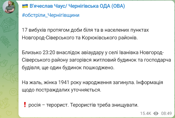 В Іванівці Чернігівської області внаслідок удару авіабомби загинула жінка похилого віку 1941 року народження, троє чоловіків поранені. Пошкоджено будівлю навчального закладу та інші споруди.