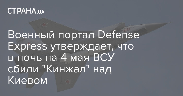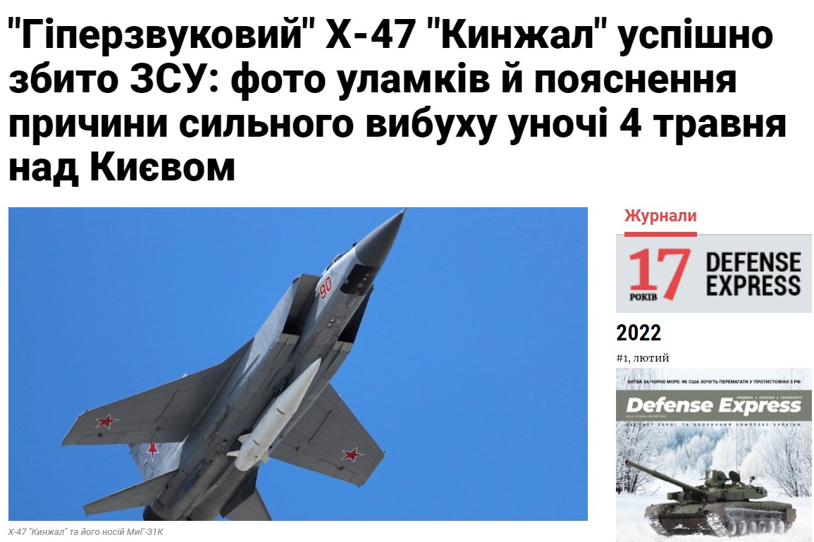 Українське видання Defense Express стверджує, що в ніч 4 травня ЗСУ збили гіперзвукову ракету "Кинжал" над Києвом.