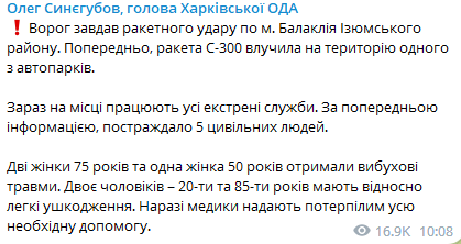 Росія завдала ракетного удару по Балаклії у Харківській області. Ракета С-300 потрапила на територію одного із автопарків, постраждали п'ять цивільних.