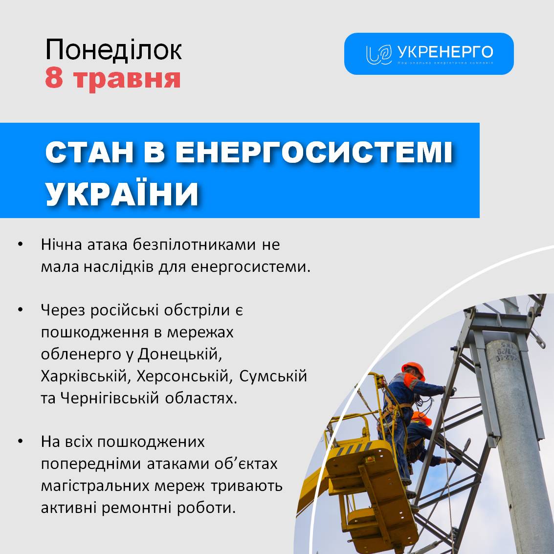 Проте через обстріл пошкоджено мережі обленерго у прифронтових районах - у Донецькій, Харківській, Херсонській, Сумській та Чернігівській областях.