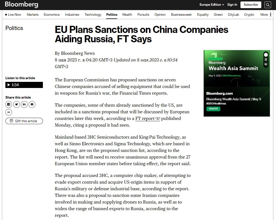 12.30 Єврокомісія вперше збирається внести до списку санкцій 7 компаній з Китаю, які постачають до Росії обладнання, яке може бути використане у військових цілях, пише Financial Times.