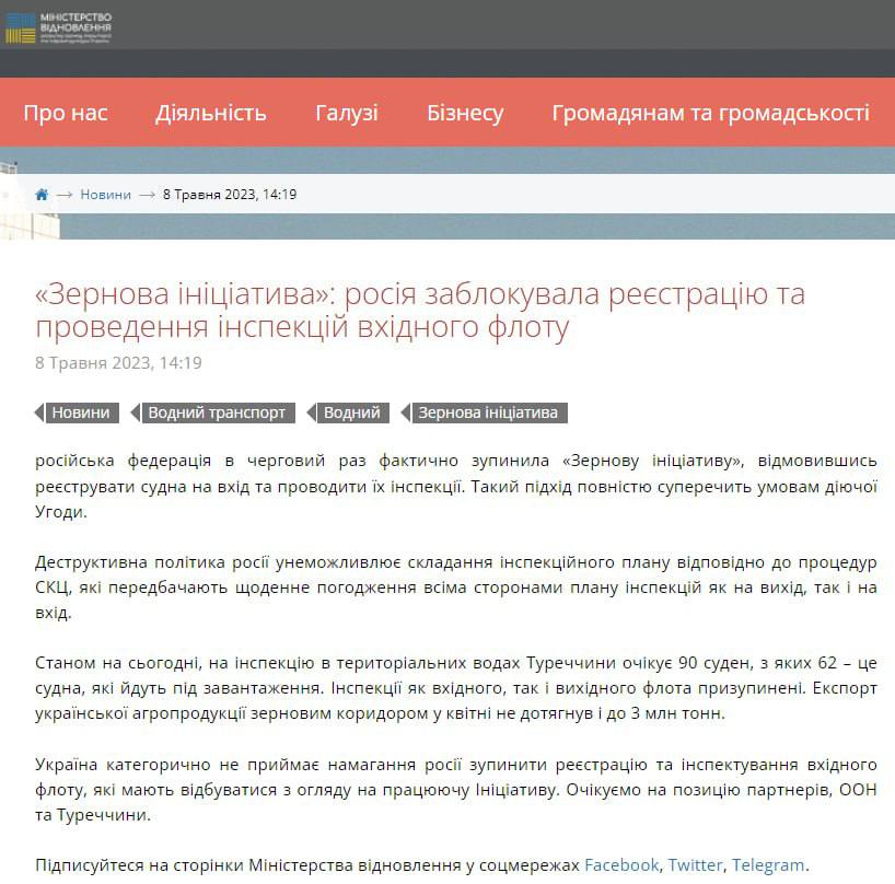14.47 РФ заблокувала реєстрацію і проведення інспекцій суден, що входять до Чорного моря, що беруть участь у "Зерновій угоді", повідомляє Міністерство відновлення.
