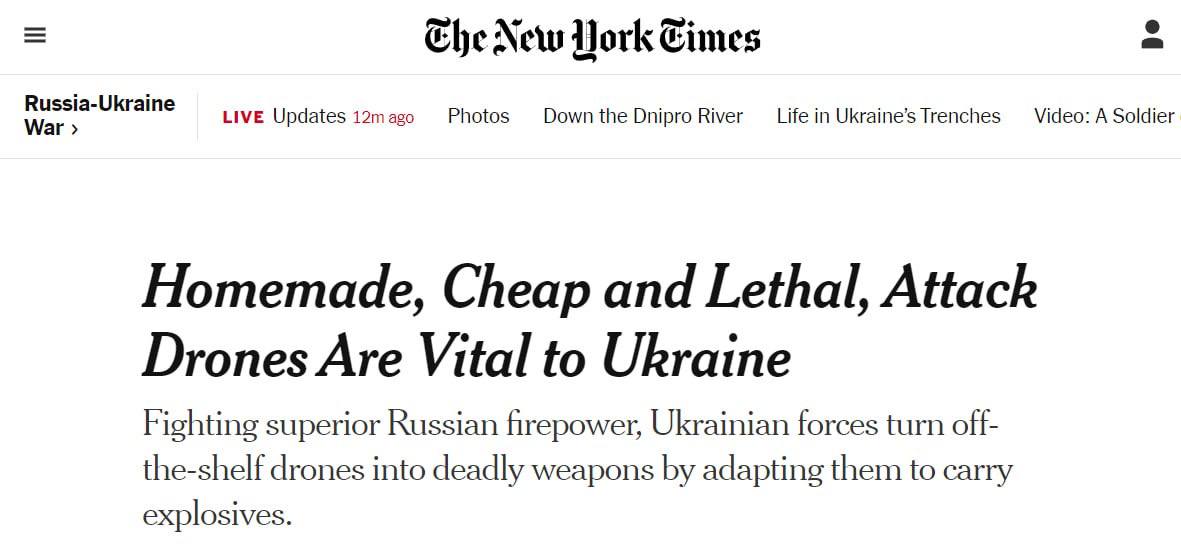 "Протягом багатьох років Сполучені Штати розміщували в Іраку та Афганістані безпілотники Predator і Reaper, які коштують десятки мільйонів доларів кожен і можуть запускати ракети, а потім повертатися на свої бази. Україна, навпаки, пристосувала безліч малих літальних апаратів, які широко доступні як споживчих товарів, від квадрокоптерів до безпілотників із нерухомим крилом, для виявлення артилерійських цілей та скидання гранат", - пише американське видання.