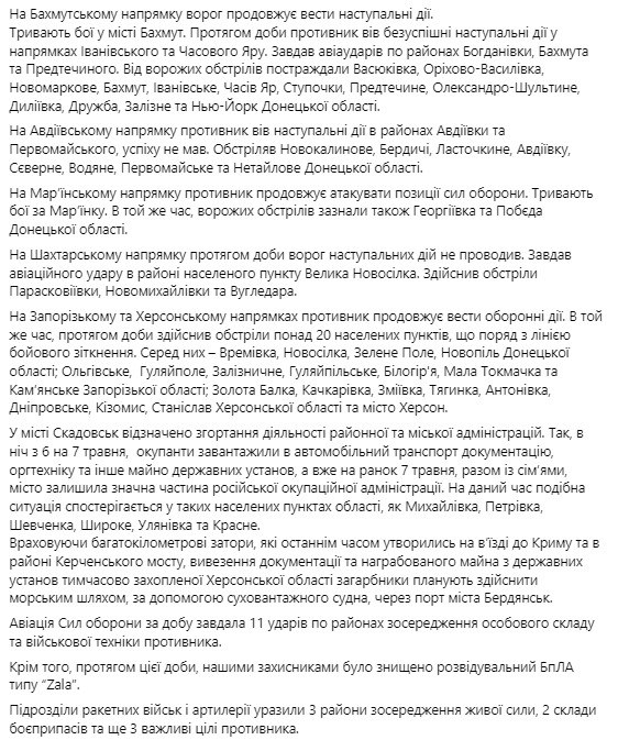3. Противник зосередив основні зусилля на Лиманському, Бахмутському, Авдіївському та Мар'їнському напрямах. Тривають важкі бої за міста Бахмут та Мар'їнка. Минулої доби було відбито 55 атак на цих ділянках фронту.