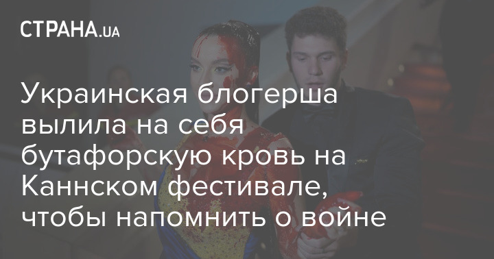 Блогер та фітнес-тренер з України Ілона Чорнобай влаштувала перформанс на червоній доріжці Канського кінофестивалю, з'явившись у сукні квітів українського прапора та обливши себе бутафорською кров'ю.