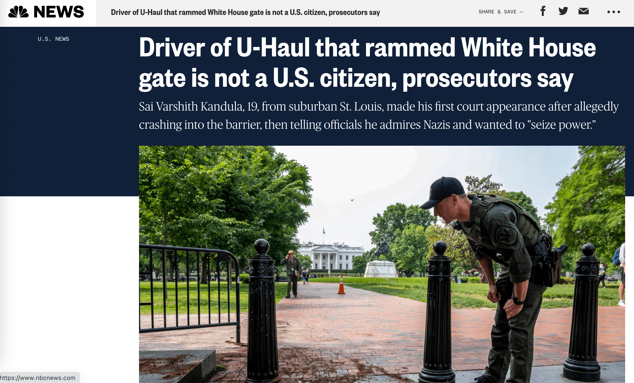 19-річний хлопець, який учора на вантажівці врізався в огорожу біля Білого дому, заявив, що захоплюється нацистами, хотів "захопити владу" та "вбити президента".