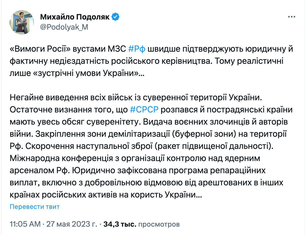 Подоляк вважає реалістичними лише "зустрічні умови України" та озвучує їх: