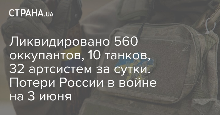 Втрати Росії у війні в Україні на ранок суботи, 3 червня, склали 560 окупантів, загальна кількість втрат російської армії з початку вторгнення складає 209 470 військових. Крім того, ЗСУ знищили 10 танків, 12 ББМ та 32 артсистем за добу.