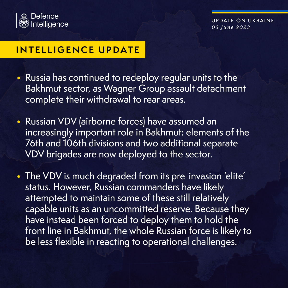 У Бахмуті дедалі більшою стає роль російських десантників після відходу групи "Вагнера". Про це повідомляє Міноборони Британії від 3 червня у Twitter.