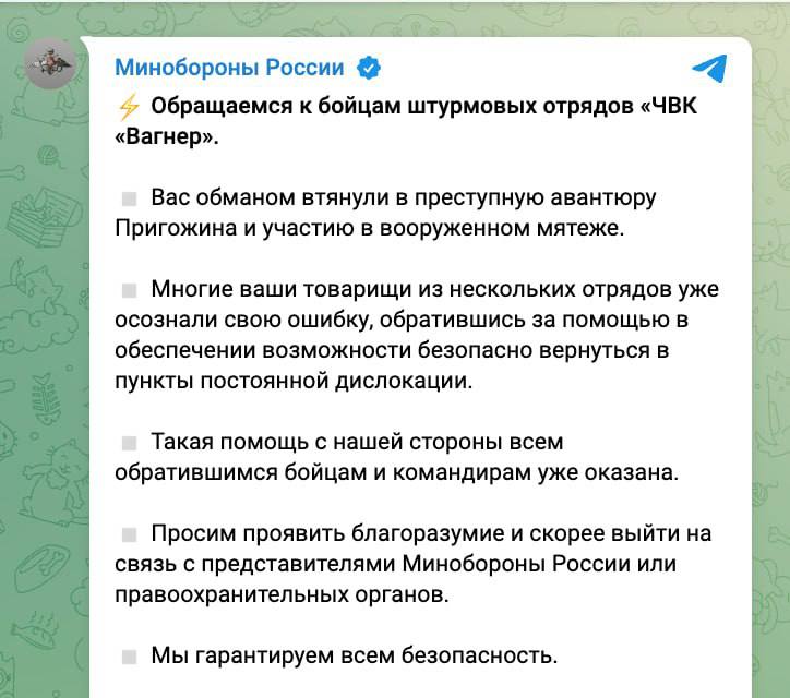При цьому Шойгу і Герасимов, зважаючи на все, поки що йти у відставку, як вимагає Пригожин, не мають наміру. Міноборони РФ звернулося до "вагнерівців", заявивши, що "вас обманом втягнули у злочинну авантюру Пригожина та участі у збройному заколоті.