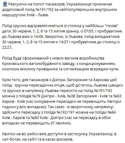 Потяг вирушатиме з Києва 30 червня, 1, 2, 8 та 15 липня о 07:05 та прибуватиме до Львова о 14:49.
