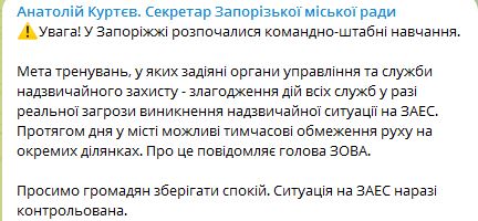 "Просимо громадян зберігати спокій. Ситуація на ЗАЕС контролюється", - повідомив секретар міськради Анатолій Куртєв.