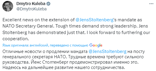 Міністр закордонних справ України Дмитро Кулеба назвав "відмінною новиною" продовження мандата Столтенберга на посаді генсека НАТО.