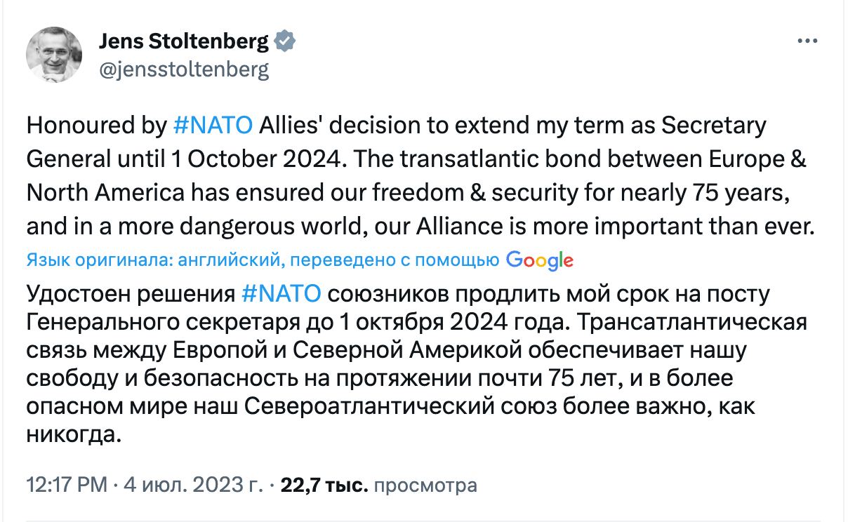 "Для мене велика честь рішення союзників щодо НАТО продовжити термін моїх повноважень як генеральний секретар до 1 жовтня 2024 року", - написав він.
