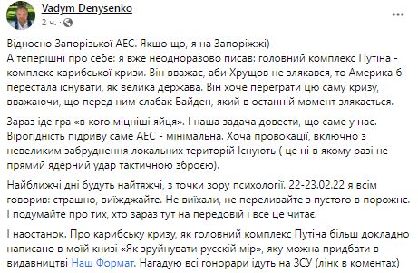 "Я вже неодноразово писав: головний комплекс Путіна – комплекс карибської кризи. Він вважає, якби Хрущов не злякався, то Америка перестала б існувати, як велика держава. Він хоче переграти цю саму кризу, вважаючи, що перед нею наляканий слабак Байден.
