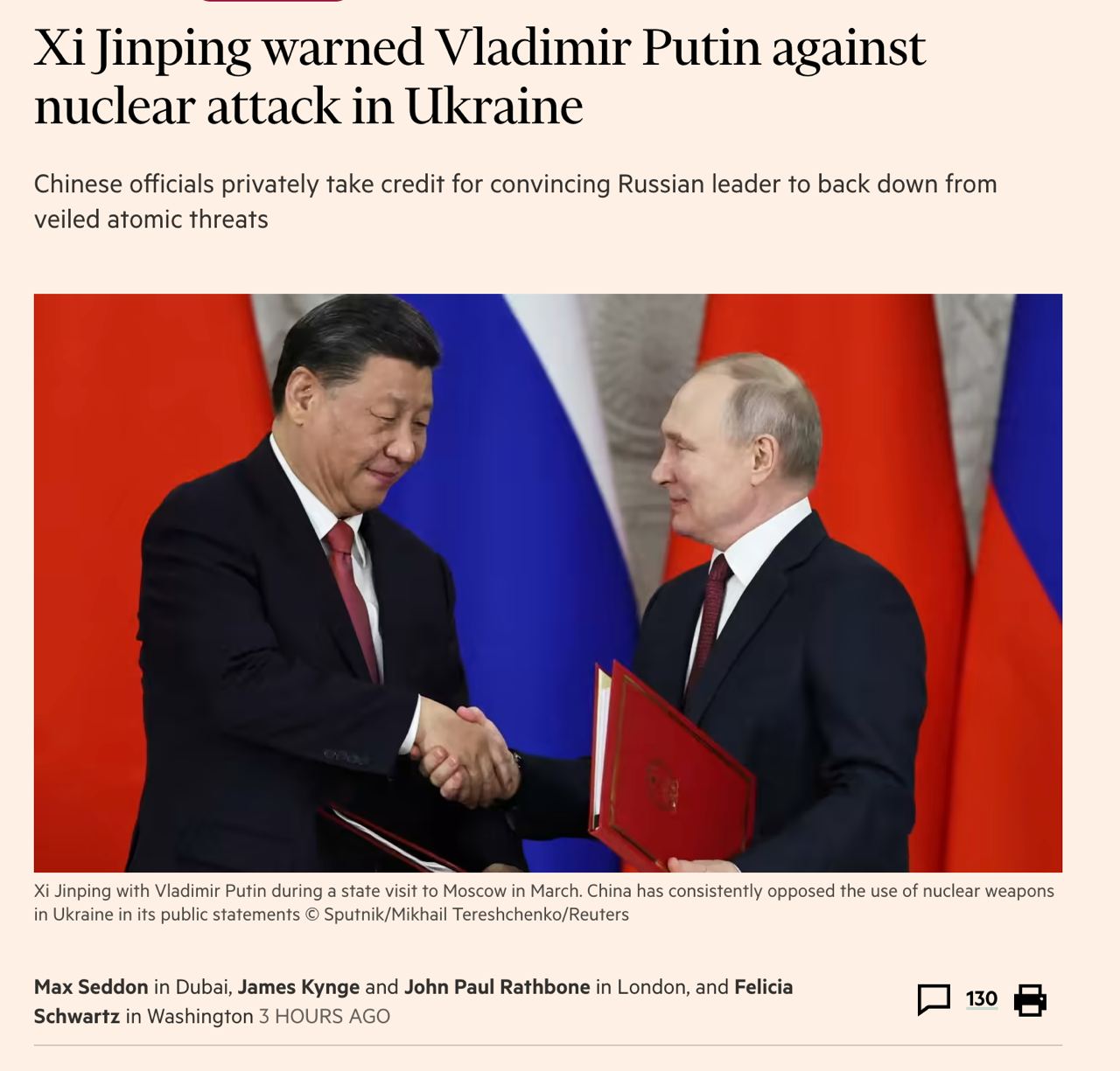 "З того часу китайські офіційні особи приватно взяли на себе відповідальність за те, що переконали російського президента відмовитися від його завуальованих загроз застосування ядерної зброї проти України", - пише FT.