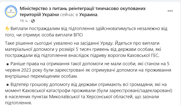 На засіданні уряду було ухвалено рішення про надання матеріальної допомоги постраждалим від підтоплення внаслідок підриву Каховської ГЕС. Держава виплачуватиме допомогу у розмірі 5 тисяч гривень.