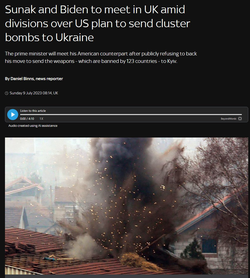 Прем'єр Ріші Сунак заявив, що Великобританія "підписала конвенцію, яка забороняє виробництво або використання касетних боєприпасів та перешкоджає їх застосуванню".