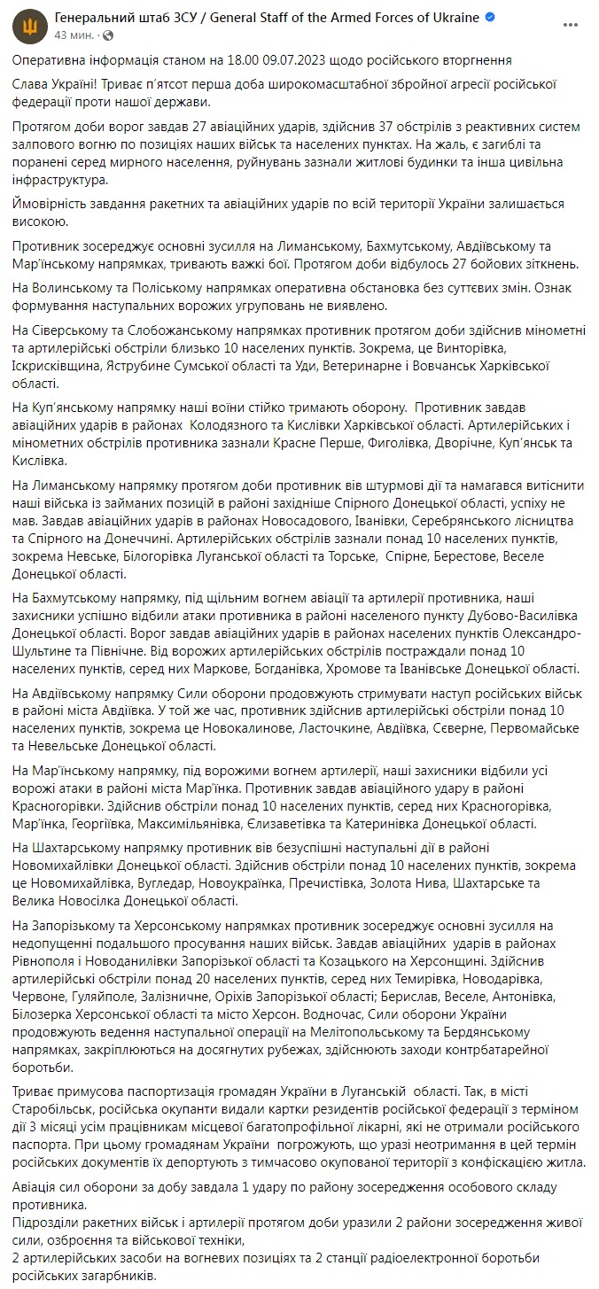 Війна в Україні триває вже 501-й день. Ми стежимо за новинами та ключовими подіями 9 липня 2023 року у своєму онлайні.