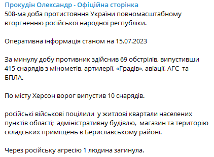 У Херсонській області минулої доби противник здійснив 69 обстрілів, випустивши 415 снарядів з мінометів, артилерії, "Градів", авіації, АГС та БПЛА. Містом Херсон ворог випустив 10 снарядів.