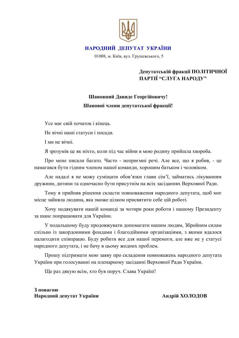 Опубліковано заяву нардепа Андрія Холодова про складання депутатських повноважень.