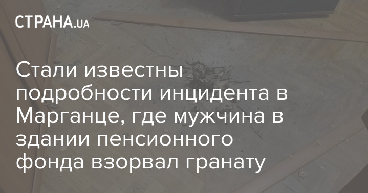 "Чоловік, який підірвав гранату, пенсіонер МВС, з 1997 року працював у відділенні поліції Марганця оперуповноваженим карного розшуку. Сьогодні, приблизно о 08.50 ранку у відділенні пенсійного фонду погрожував гранатою, здійснив захоплення співробітниці пенсійного господарства, а саме захоплення співробітниці пенсійного фонду, забезпечення управління пенсійного фонду № 7. Після чого привів у дію гранату. В результаті він отримав уламкові поранення тулуба, сторонні особи не постраждали", - розповіло джерело.