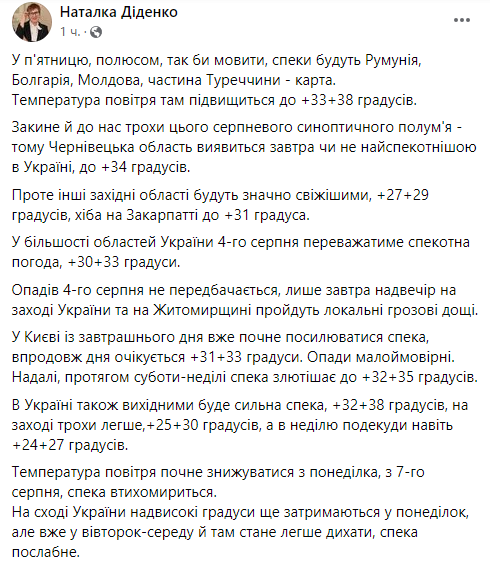 Про це повідомляє синоптик Наталія Діденко у Facebook.