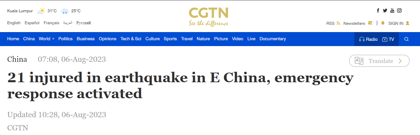 У китайській провінції Шаньдун стався землетрус магнітудою 5.5 балів за шкалою Ріхтера.