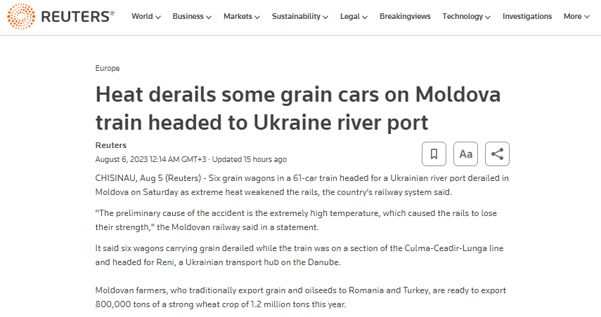 У Молдові через аномальну спеку зійшли з рейок 6 вагонів із зерном, які прямували до українського порту Рені на річці Дунай.