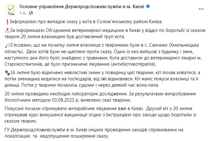До столичного відділу боротьби зі сказом тварин 20 липня жінка доставила труп свого кота. Як виявилося, на початку липня господиня тварини разом із двома кішками відвідувала село Санчики на Хмельниччині. Обидва вихованці не були щеплені проти сказу. Один із них пішов з дому і зник, але наступного дня його знайшли із травмами. Кота доправили до ветеринарної лікарні Старокостянтинова, де йому призначили лікування – антибіотикотерапію.