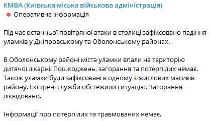 Уламки збитих ракет виявлено у Дніпровському районі та на житловому масиві Оболонського району. Було загоряння, його вже загасили.