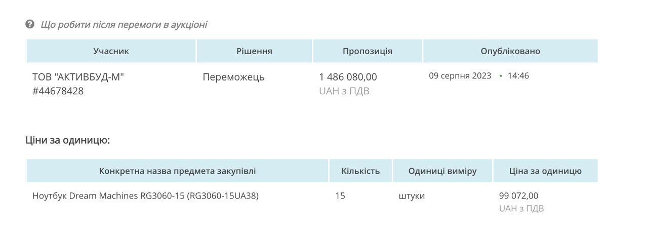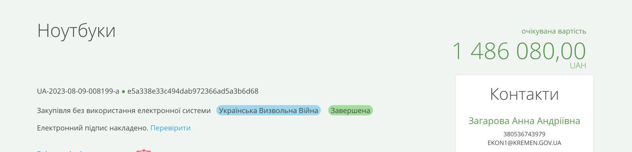 Загальна сума операції склала майже 1,5 млн. гривень. Закупівлю провели без тендеру.