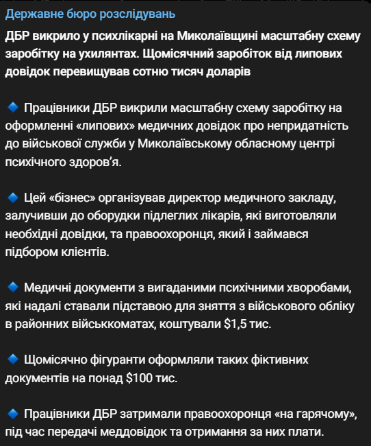 У Миколаївському обласному центрі психічного здоров'я викрито масштабну схему оформлення фальшивих довідок для ухилянтів від мобілізації. Їх оформляли як психічно хворих, причому тариф за цю послугу був у рази менший, ніж у військкоматах.