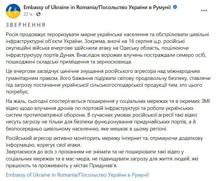 Українське посольство в Румунії звернулося до мешканців прикордонних румунських територій із проханням не знімати роботу ППО та моменти російських прильотів по портам України.